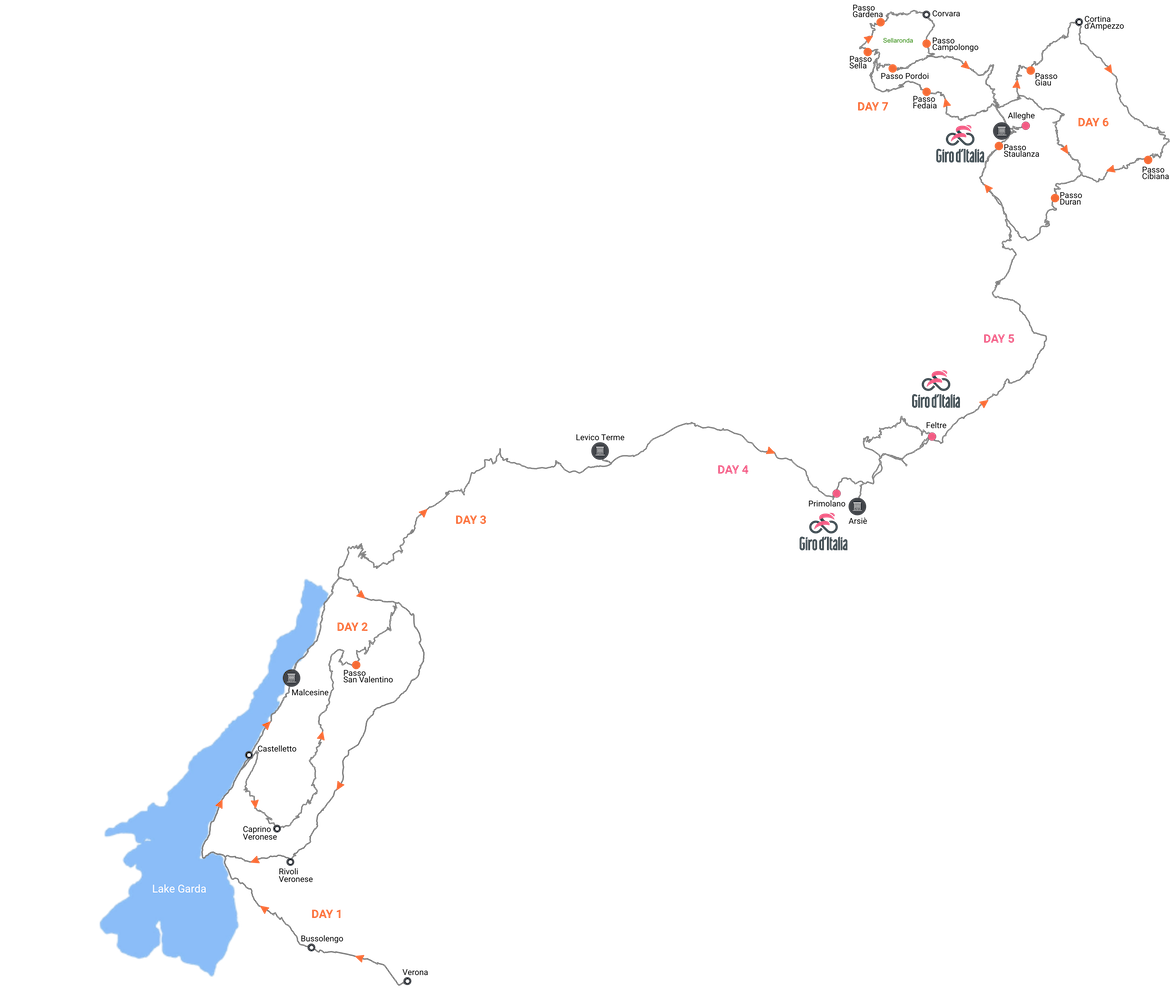 After a warm up on the shores of the outdoor mecca of Lake Garda, the trip passes through the beautiful Valsugana Valley for the first Giro viewing. Then it's on to the Dolomites for an immersive experience of "queen" stage 19: Feltre - Piani di Pezzè. Two more full days in the Dolomites rounds out this epic tour. Go home with tired legs, a ton of dramatic photos, and countless memories. Viva il Giro!